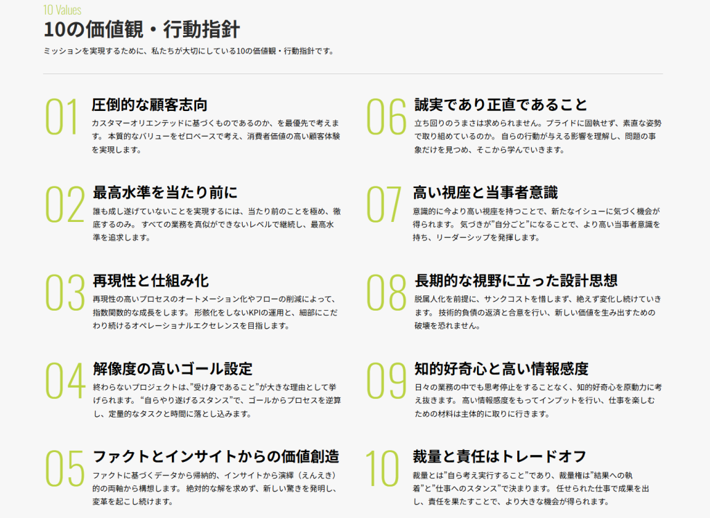 Amazonのリーダーシッププリンシプルと同様に、クーリエの10 Valuesは面談・評価の基準として実用的に活用されていて、形骸化していない実践的な指標として機能しています。単なるお題目ではなく、日々の業務判断や人事評価の具体的な基準として生きています。