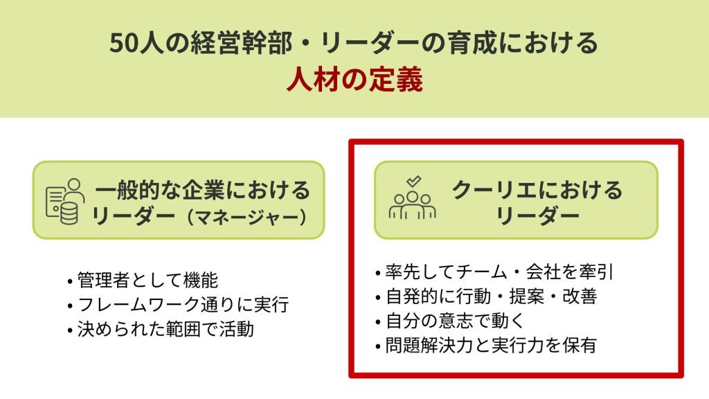 「50人の経営幹部・リーダーの育成」というのは、クーリエの今後を担う、「問題解決ができ・実行力のある・意思を持った」人材の育成、輩出を推進する組織戦略です。