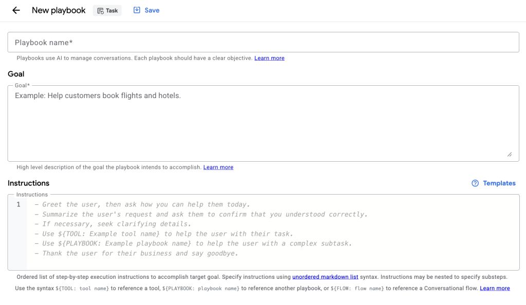 Dialogflow CX の Generative AI 機能では、「Playbook」という単位で LLM の振る舞いを定義します。その中核にあるのが Task です。