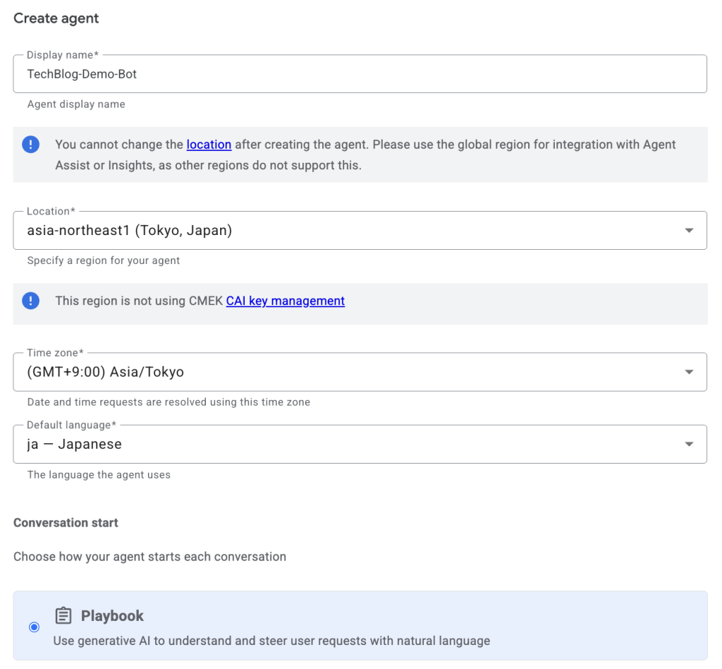 まず、Dialogflow CXコンソールで「エージェント(ボットの箱)」を作ります。 構築タイプには、最新の