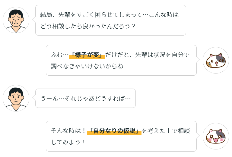 連絡・相談・報告の各ポイントを「事例→イラスト→解説」の順に紹介。報連相それぞれのポイントを約1,000文字でシンプルにまとめ、休憩の合間でも読みやすい記事構成になっています。